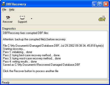 Bạn không cần phải có bất kỳ kỹ năng trong việc khôi phục các tập tin DBF để sử dụng chương trình này. Nó xác định các định dạng tập tin tự động. Chương trình nhận tất cả các định dạng được sử dụng bởi ứng dụng xử lý phổ biến DBF: Dbase III / IV, FoxPro, Visual FoxPro và những chương trình khác. Một công cụ phục hồi hoàn toàn tự động sử dụng trí tuệ nhân tạo để sửa chữa tập tin bị hư hỏng một cách chính xác nhất.